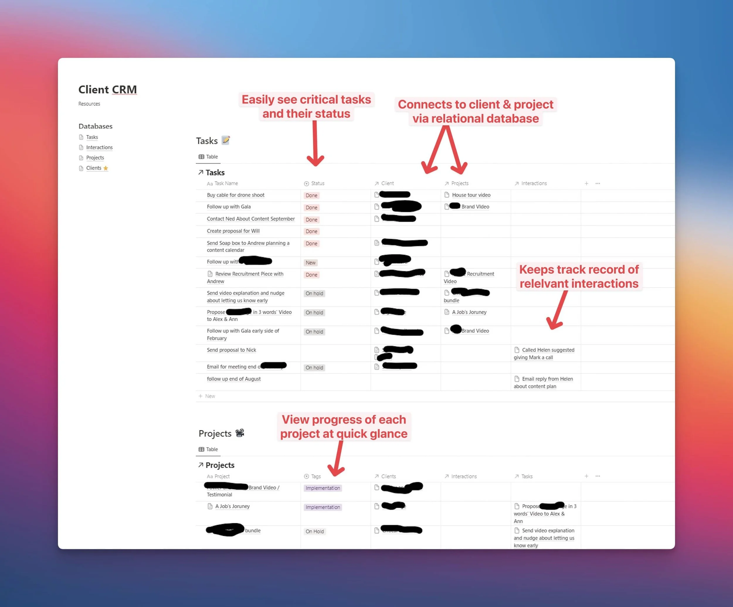 Building a CRM (in Notion): Max organizes his client projects in Notion, creating dedicated pages for each client. He keeps track of project details, including timelines, milestones, and deliverables, all in one centralized place. This allows him to stay on top of tasks and ensures smooth communication with clients throughout the project's lifecycle.