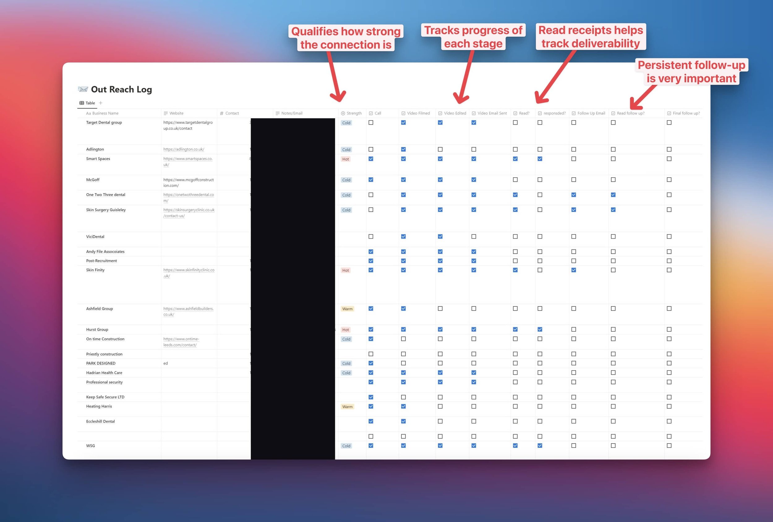 Outreach Tracker (in Notion): Max also keeps track of his video outreach using a database in Notion. This allows him to build up a list of potential clients, develop an outreach plan, then follow-up easily on a set schedule.