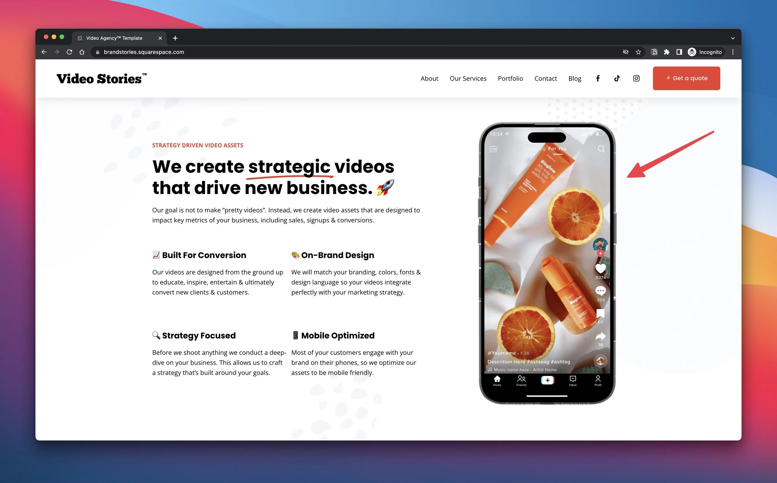 For the iPhone image on the homepage, I used a free .PSD mockup that I found by an artist called Micro Volume on Gumroad. I also downloaded a free TikTok UI .PSD template and combined it with the iPhone mockup to get what you see here: